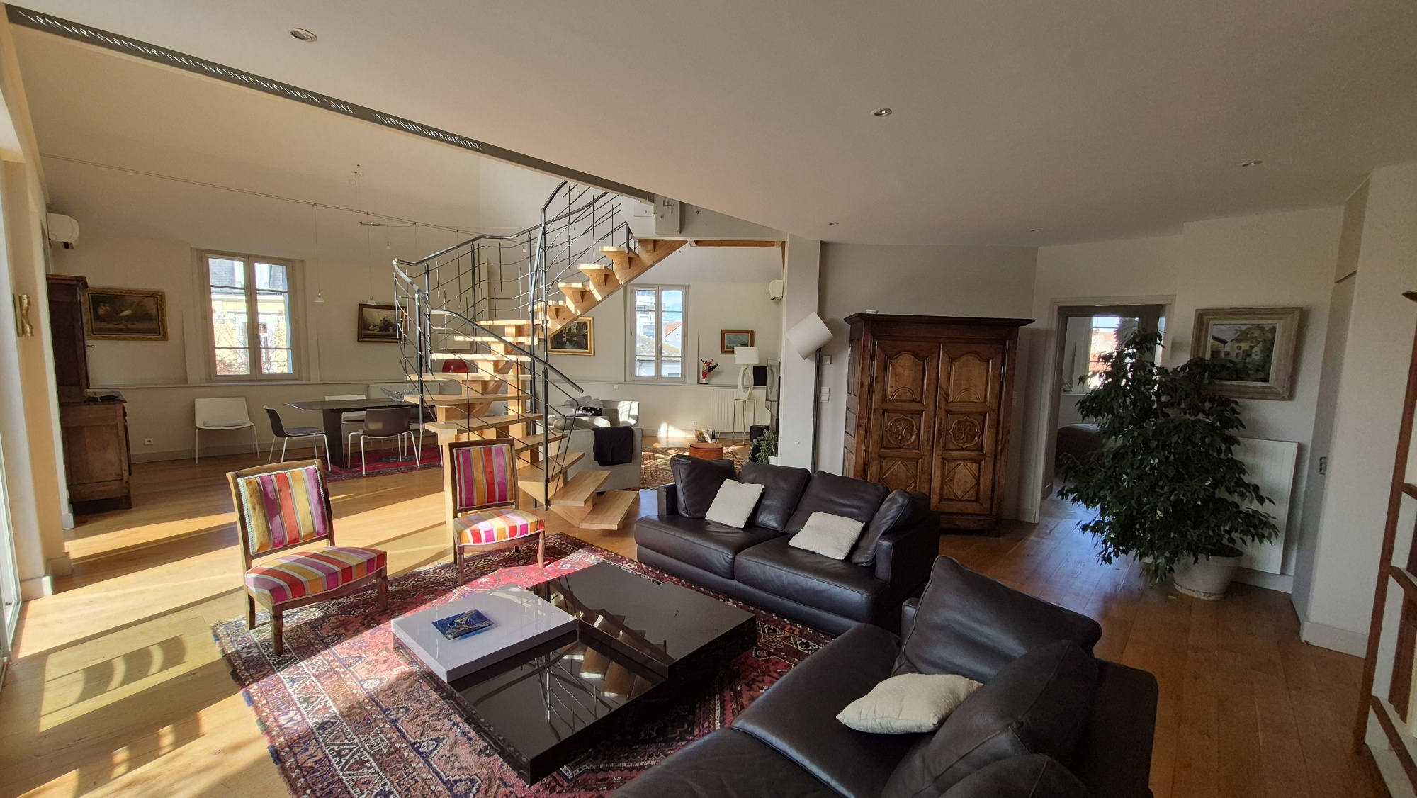Situé en plein cœur de Vichy, ce duplex exceptionnel de 207,63m² habitables offre des prestations rares et un cadre de vie privilégié. Baigné de lumière grâce à ses vastes ouvertures et son exposition plein sud, il dispose d’une agréable terrasse de 20m². L’entrée s’ouvre sur une spacieuse pièce de vie avec un plafond cathédrale (HSP 5.65m) pour un total de 71m², largement vitrée et donnant directement sur la terrasse, ainsi qu’une cuisine semi-ouverte de 17 m² bénéficiant également d’un accès extérieur. Ce niveau comprend trois chambres de 10,71m², 11,47m² et 12,07m², une salle d’eau et un WC indépendant. À l’étage, une très vaste suite parentale se compose d’une chambre de 14,18m², d’un bureau de 15,54m², d’une salle de bains avec douche et baignoire, d’un dressing et d’un WC. Au rez-de-chaussée de la copropriété, un triple garage de 84m² avec jardinet privatif donne accès à un ascenseur lui aussi privatif desservant directement l’appartement. Charges annuelles de copropriété : 2100€, foncier : 2800€. Chauffage gaz et climatisation PAC air/air, DPE réalisé le 23/02/2026, C (128), estimation des coûts annuels d’énergie comprise entre 2470€ et 3400€ pour un usage standard, prix moyens des énergies indexés sur les années 2021, 2022 et 2023 (abonnements compris) / GES: C (18). 800 000€ HAI – 760 000€ net vendeur soit 5,23% TTC d’honoraires charges acquéreurs. Les informations sur les risques auxquels ce bien est exposé sont disponibles sur le site Géorisques : www.georisques.gouv.fr